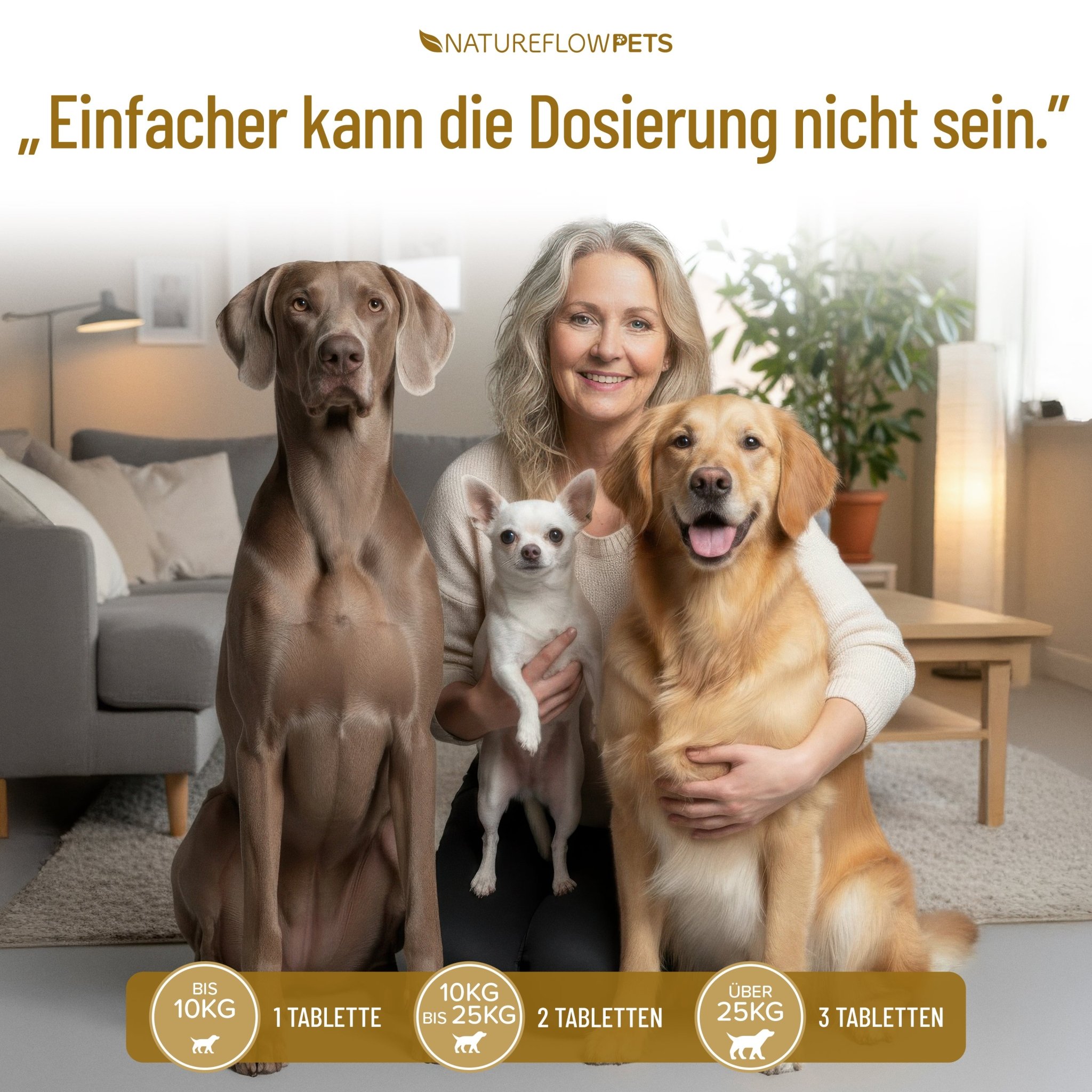 Praktisch dosierbar: 1 Tablette pro 10 kg Körpergewicht – einfach ins Futter geben – für eine intakte sowie starke Darmflora und ein aktives Hundeleben.