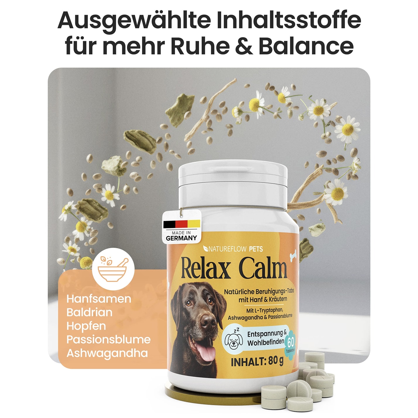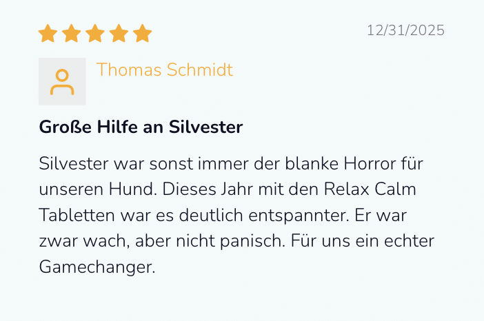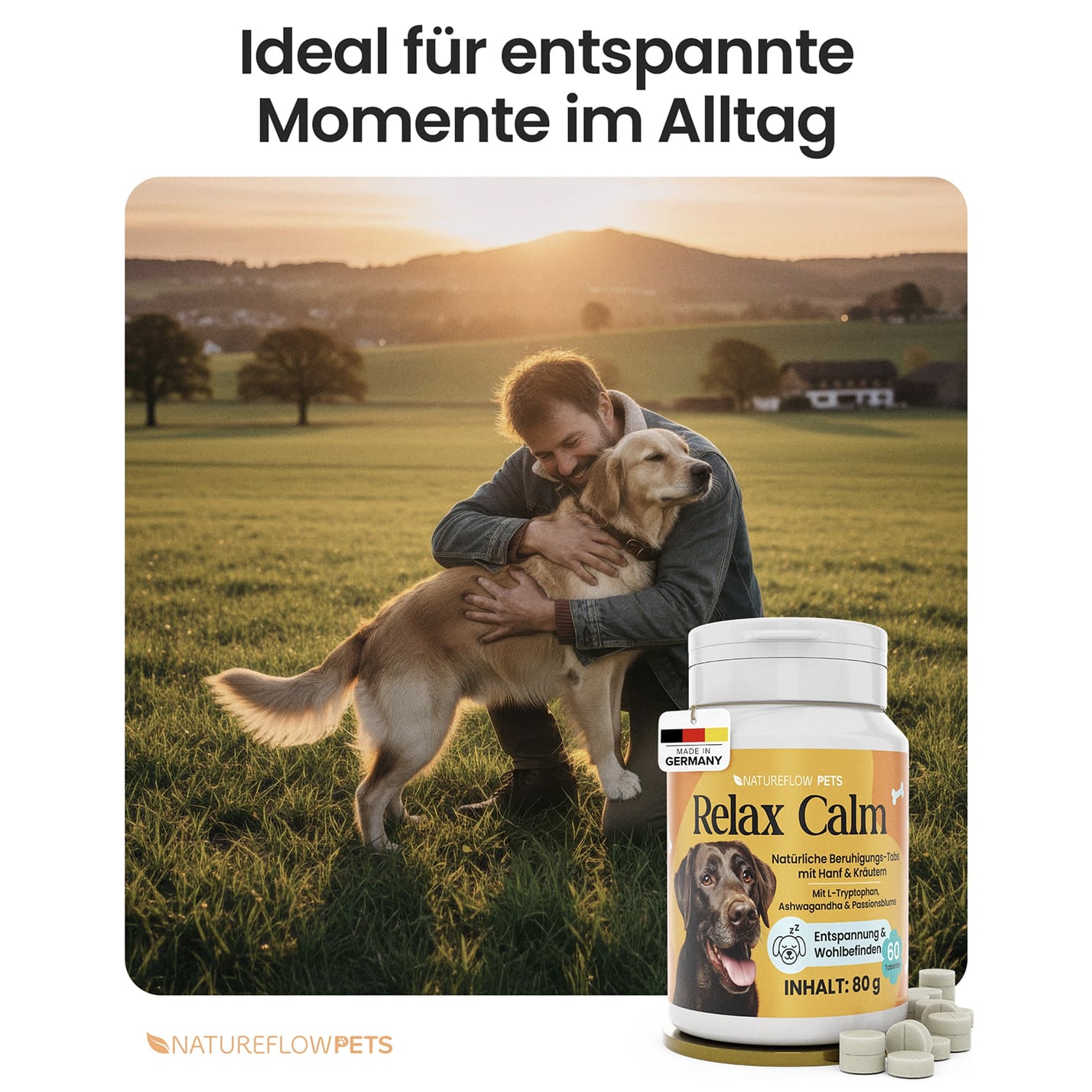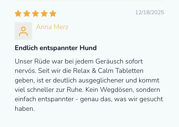 Mit den Relax Calm Tabletten von Natureflow Pets erhältst du ein hochwertiges, natürliches Ergänzungsfuttermittel, das speziell zur Unterstützung von Entspannung, innerer Ruhe und emotionalem Gleichgewicht deines Hundes entwickelt wurde – ideal bei Stress, Unruhe, Angst, Nervosität oder in herausfordernden Situationen wie Alleinbleiben, Reisen, Silvester oder Tierarztbesuchen.
