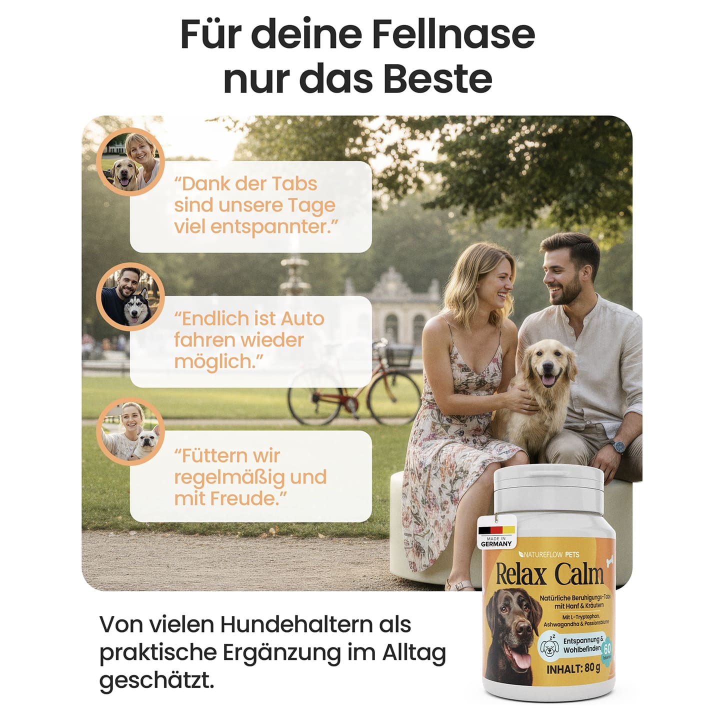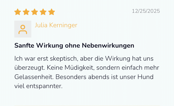 Schonende Beruhigung ohne Sedierung – fördert Entspannung, ohne müde zu machen oder die Aufmerksamkeit deines Hundes zu beeinträchtigen.